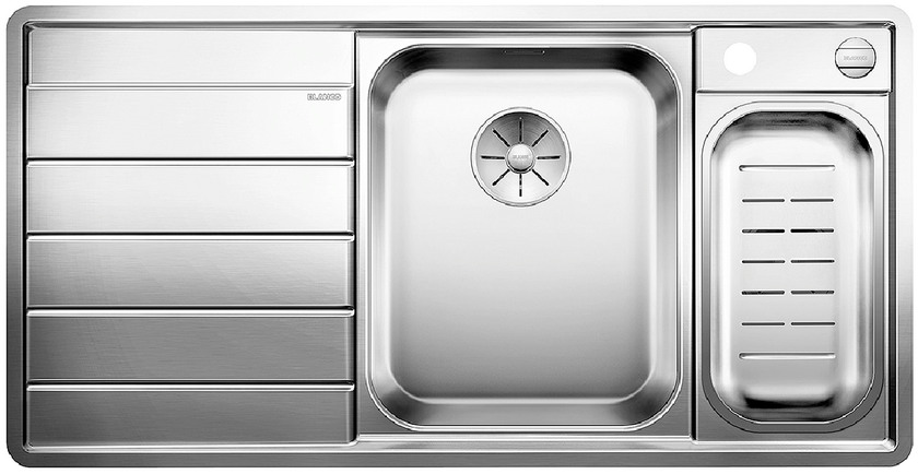Blanco AXIS III Evier en inox satiné. Le concept AXial : une ergonomie unique. Cuve élégante et généreuse avec fond aux contours marqués offrant une surface maximale pour accueillir en toute sécurité verres et objets volumineux. Enchaînement fluide e